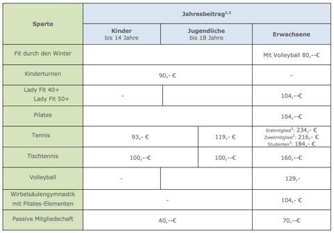 1. Der Jahresbeitrag aktiver Mitglieder enthält einen Hauptvereinsbeitrag von 40,- € (Kinder & Jugendliche) bzw. 70,- € (Erwachsene). Bei Mehrspartenzugehörigkeit wird der Hauptvereinsbeitrag wird nur einmal berechnet.
